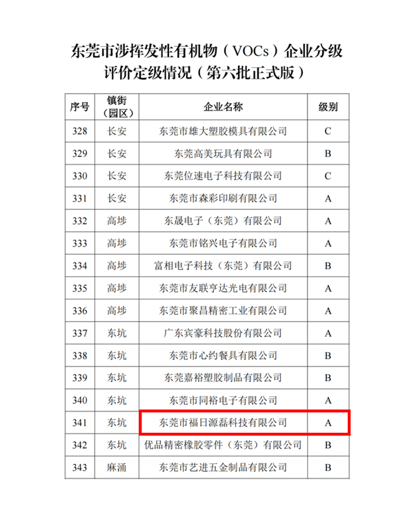 近日,東莞市生態環境局公布第六批涉揮發性有機物(VOCs)企業分級評價結果。福日電子成員企業源磊科技憑借規范完備的治理體系與持續向好的環保成效,成功獲評最高等級——A級企業,環境管理能力躋身行業與區域的標桿行列。